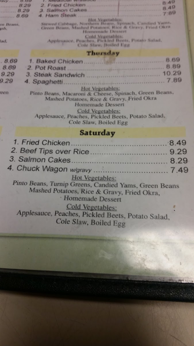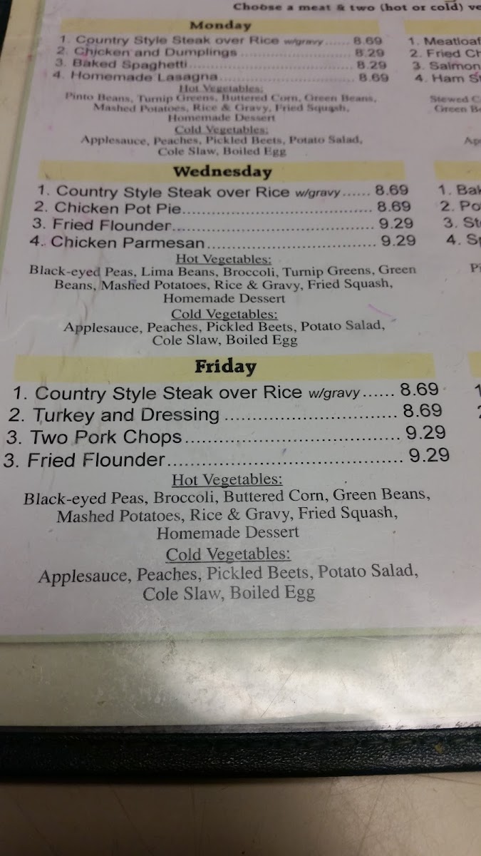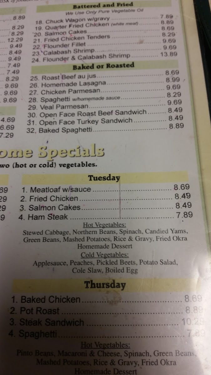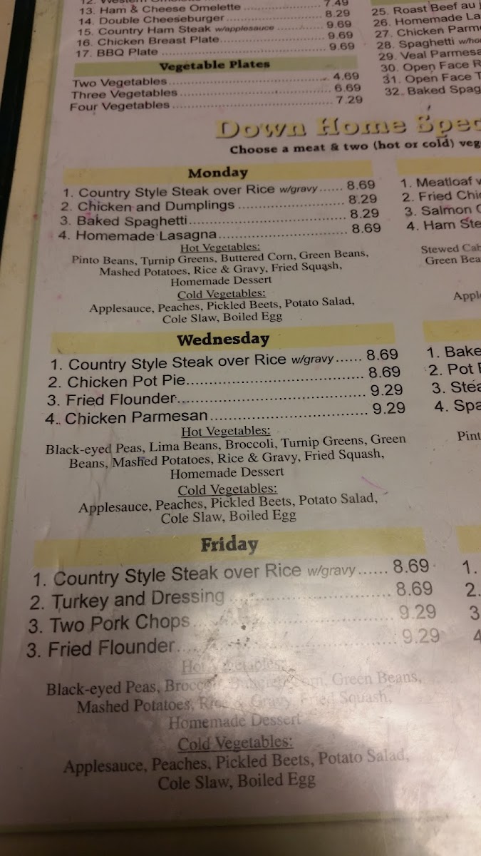 For lunch and dinner, the menu continues with comforting Southern staples including meatloaf, steak and eggs, and seafood options like flounder and Calabash shrimp. Daily housemade soups and simple garden salads offer lighter choices, while the children's menu and burger plates give families plenty of options to pick from.